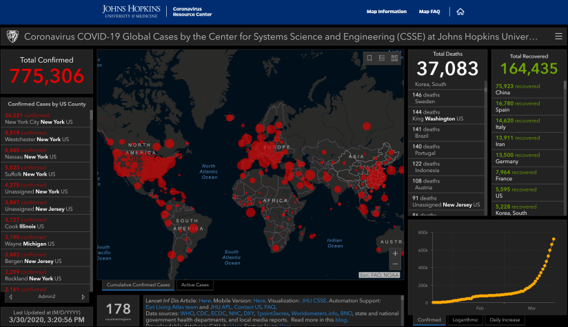 Here are the numbers from John Hopkins Coronavirus Resource Center as of March 30, 2020.